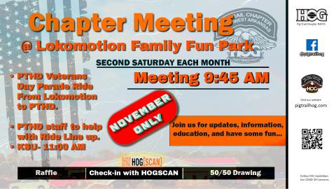Join us for the November only Chapter Meeting where we talk briefly about upcoming activities/rides, learning series, and raffles. Ride to Honor Our Veterens. We will meet Lokomotion Fayetteville https://www.facebook.com/LokomotionFun/.