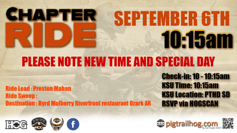 Closed Event: Chapter activities are conducted primarily for the benefit of H.O.G. Chapter members. Closed Events are those events open to Chapter members and one guest per member.  All guests must sign an event release. Be aware, all rides and events are subject to change or cancellation due to weather or other circumstances beyond our control.