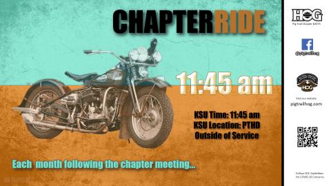 Join us for our monthly chapter ride following our chapter meeting! We'll gather outside the service department at 11:30 AM for check-in and a pre-ride discussion. Here are the details: