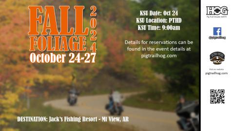 The annual fall foliage ride/weekend will be held for four days / 3 nights. We will be going back to Jack's fishing resort in Mt View, AR due to poplularity and request.