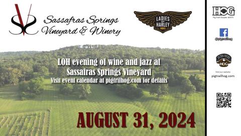LOH evening of wine and jazz at Sassafras Springs Vineyard on Saturday, August 31. This event is open to all PTHD HOG Chapter ladies as well as their spouse/partner. Live music from the Roby Pantall Jazz Duo from 6-9pm. The Vineyard serves charcuterie, salad and pizza as well as wine and non-alcoholic beverages.  Meet at the vineyard at 5pm or join the optional ride departing PTHD at 3:30pm.