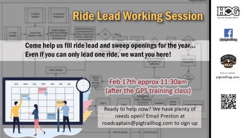 Right after the GPS training, join us for our Ride Lead Working Session. Come help us fill ride lead and sweep openings for the year (even if you can only lead one ride, we want yo here!).
